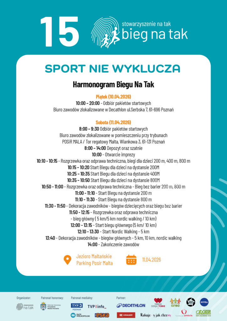 Bieg Na Tak to wydarzenie, które co roku nabiera mocy dzięki wsparciu sponsorów i darczyńców. To właśnie dzięki firmom i ludziom o wielkich sercach możemy rozwijać to wyjątkowe przedsięwzięcie, łączące sport, integrację i pomaganie.
